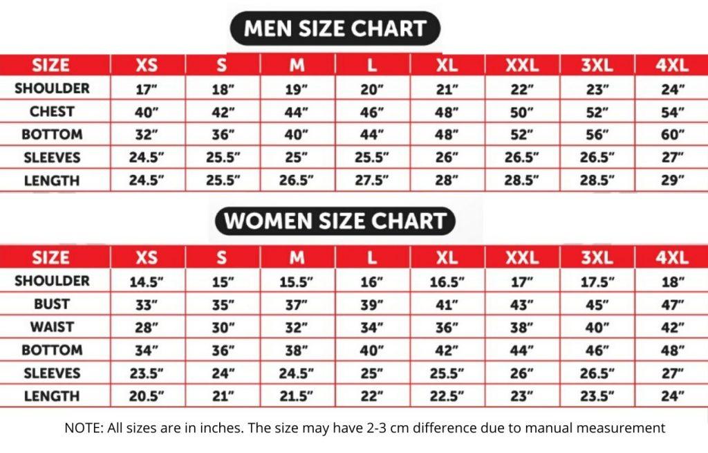 - Buyers are requested to choose their required size according to our mentioned size chart NOT according to what they usually wear locally. As we ship worldwide the sizes can vary from country to country, we cannot have a region-specific size chart.