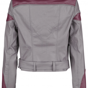Dress as our favorite Star Wars character, Ahsoka Tano, in this faux leather jacket inspired by her costume in Star Wars Rebels. The slate and plum faux leather jacket is accented with burnished silver hardware, including snaps on the collar, zipper closure hip pockets, the buckle on a removable belt and a center zipper closure. A Fulcrum symbol is discreetly embroidered on the center back and the blue and white satin lining is inspired by Ahsoka’s Lekku.
