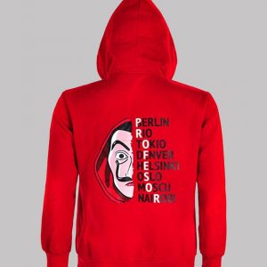 This stylish Money Heist Hoodie we are bringing for you is to basically pay an ode and tribute to the show from your end. This attire is created out of genuine and premium quality fabric which together with the support of viscose inner lining attract enormous ease and comfort for you keeping you warm all the time. Red in color, the outwear has hooded collars, long-length sleeves, stylish cuffs, a zip up front closure, zippered rightly placed pockets, and a back printed with the names of all the amazing members of the team making this outfit a statement piece.