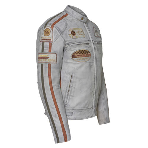 Now available in a washed out grey cowhide leather with contrasting antique YKK zippers and brown and black cruiser striped going across the sides and sleeves. We have added to our British badge collection and now have a range available in 3 colours. This jacket comes fully equipped with double black lining; one which is quilted polyester and removable. The attached lining comes with velcro pockets in the shoulders, back and elbows which is suitable for bikers. These can easily be slotted in and removed so the jacket can also be worn as a fashion jacket. With a number of external pockets and 2 internal pockets to hide your valuables.