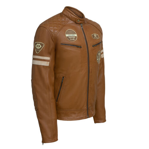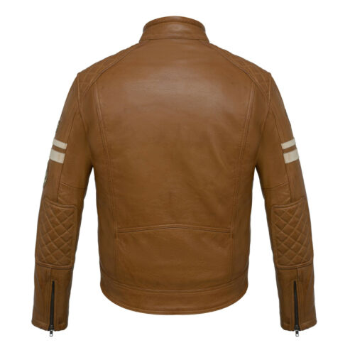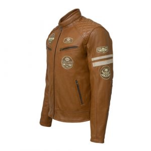 Now available in tan leather, we have extended our range for the British badge cruiser jackets. With all the classic badges on the chest and sleeves and the classic cruiser stripes in off white and brown. Made from cowhide leather, the mens jacket comes with double lining, one which is removable and can easily be taken out. The fixed lining comes with velcro armour pockets in the shoulders, back and elbows. With a number of size adjustment features such as waist belts, zipped sleeves and buttoned collar strap. A classic style biker jacket which can be worn on and off the bike.