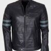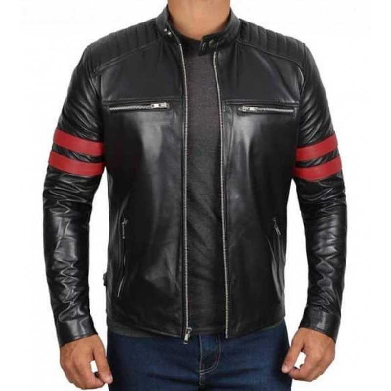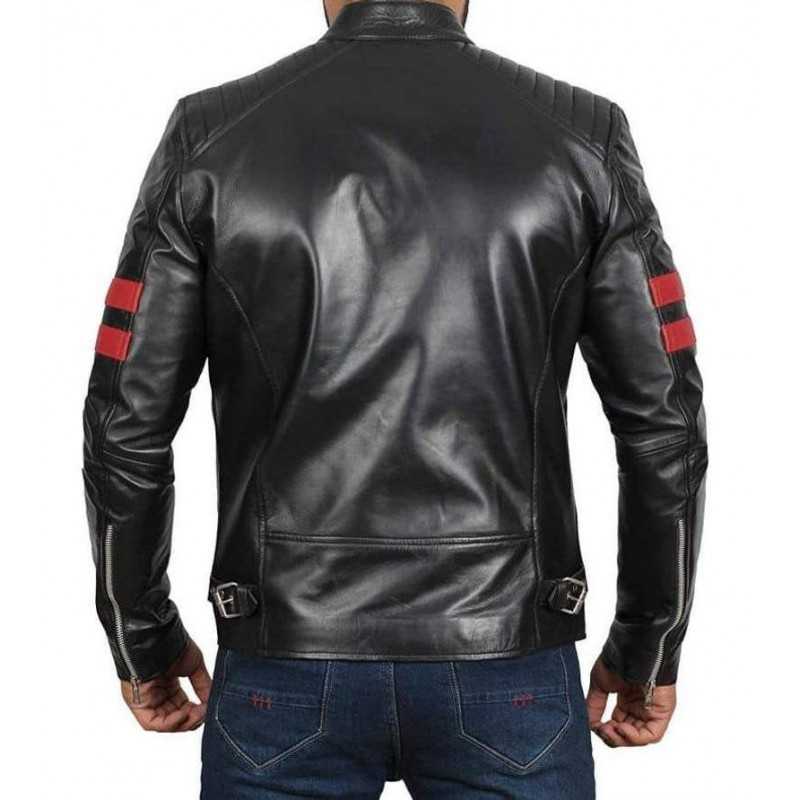 Mens Black Quilted Red Stripe Cafe Racer Leather Motorcycle Jacket