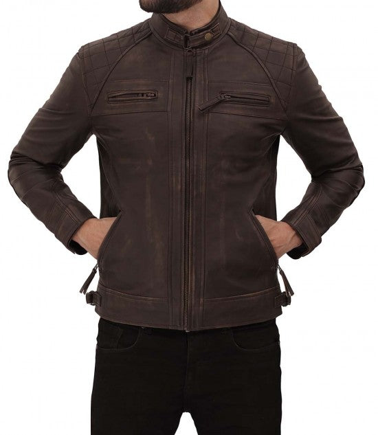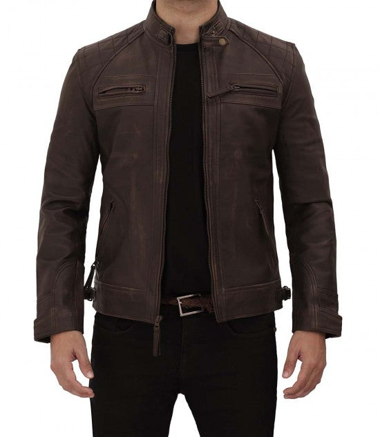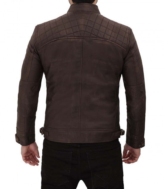 Mens Quilted Cafe Racer Distressed Leather Brown Jacket