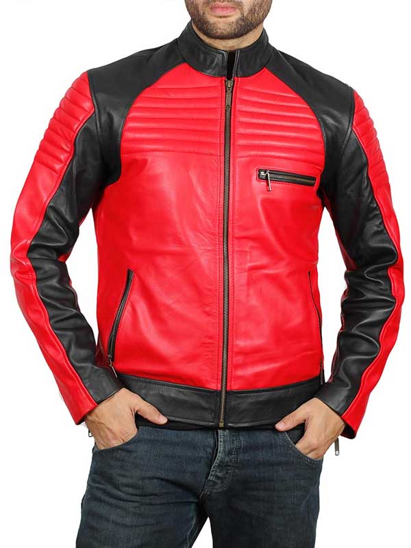 The Men’s Red And Black Leather Jacket is fabricated from good quality genuine leather. The stunning red and black jacket has a stand up collar with zipper closure. The sleeves of Men’s Red And Black Biker Leather Jacket are full with zipper cuffs. The jacket is comfortable to wear as it has soft viscose lining on the inside. To keep things the jacket has two side waist pockets and one chest pocket. Fine quality stitching of Men’s Biker Leather Jacket adds to its perfection.