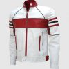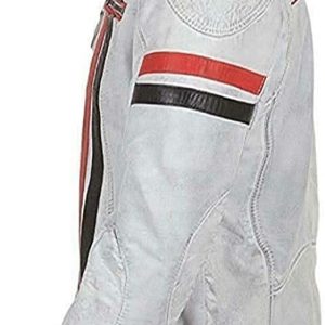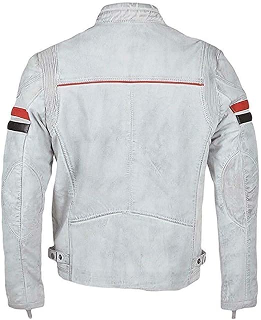 Cafe Racer Retro White Jacket is manufactured from genuine leather and has this White Cafe Racer Motorcycle Retro Jacket has black and red stripes on left side and on both sleeves.