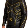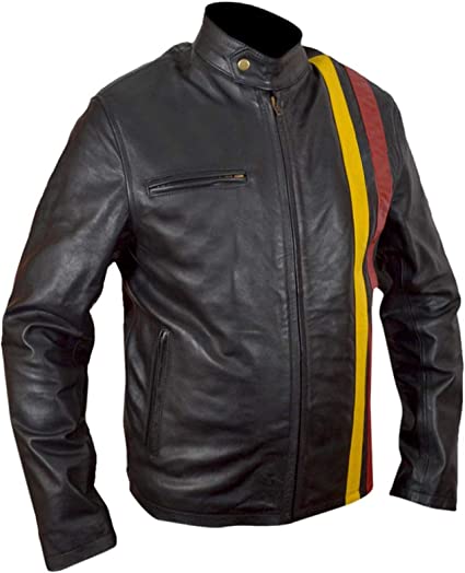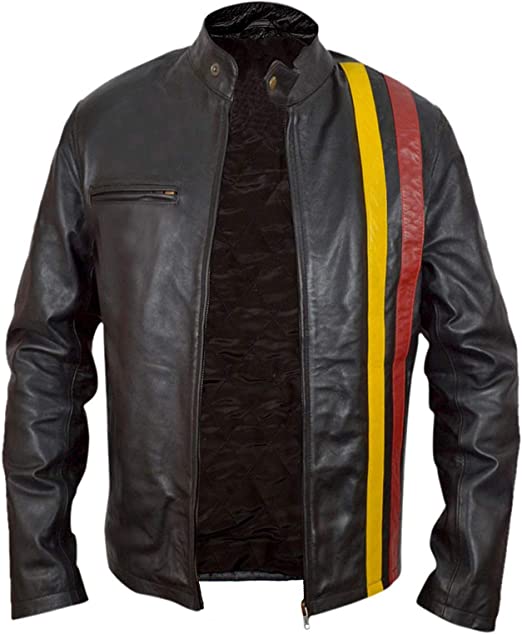 Cafe Racer Stripes Motorcycle Jacket is black in color which has been manufactured from genuine leather. The left side of Mens Vintage Biker Racing Black Leather Jacket has 2 vertical stripes in maroon and yellow color.