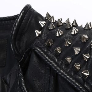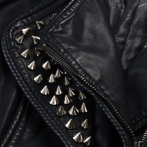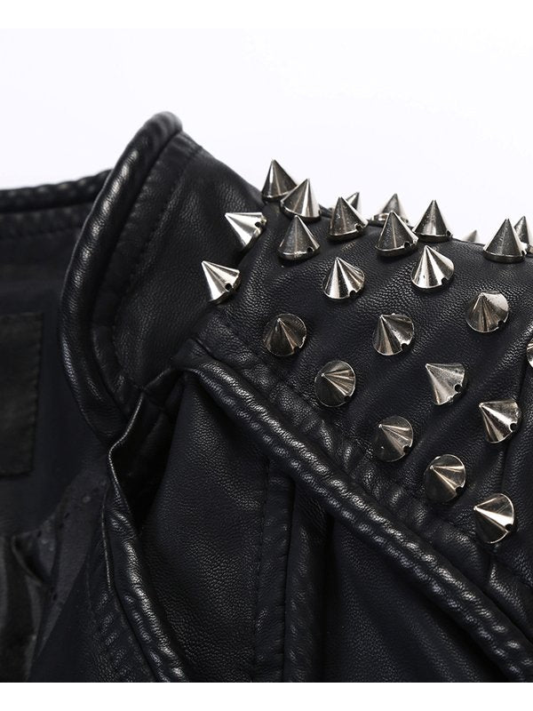 The color is black and the jacket is studded with silver pointed pieces on the shoulders and chest.