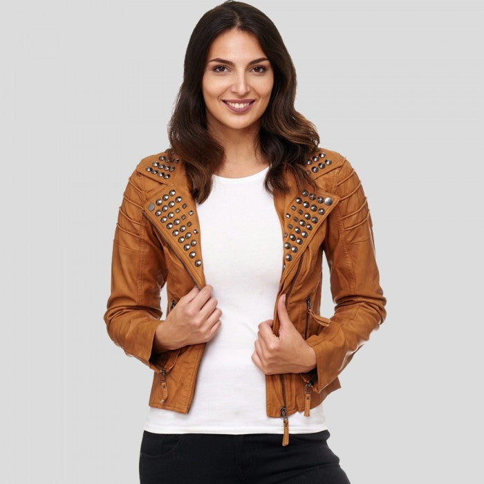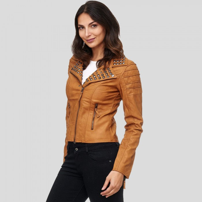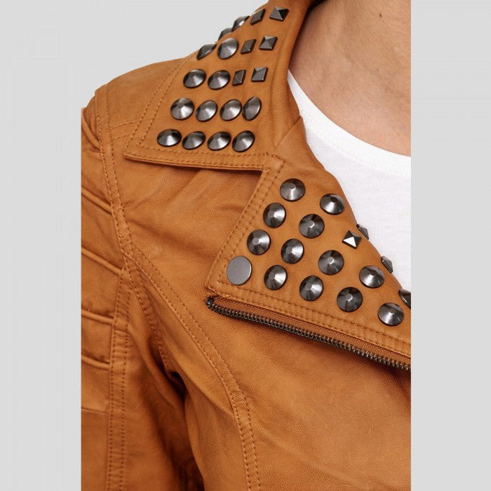 Plus, there are such endless engaging features are introduced in this upscale Tan Brown Leather Biker Studded Jacket For Womens is an extension of top-quality novel real faux leather nearby an internal sewed thick covering to keep you warm and loosen up. Its elements consolidate a peak lapel neck area with zipper cuffs, there are in like manner two zipper abdomen pockets for stuff and a zipper closure in front.