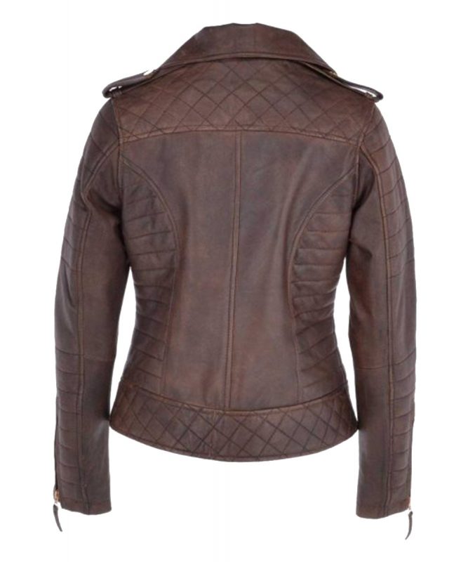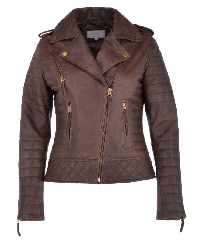 Grab the attention of the audience in all casual and formal events with the specified Women’s Biker Distressed Leather Jacket. This outfit will boost the elegance of your stunning appearance and magnificent look with your formal apparel. Also, it features an asymmetrical style and four front zipper pockets with padded and quilted style, so put your hands on it before it goes out.