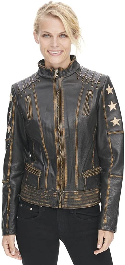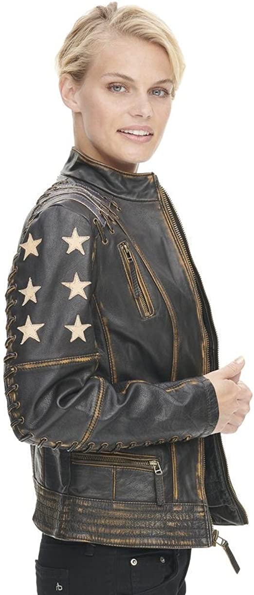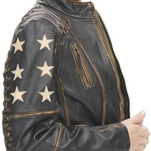 Womens distressed black stars and stripes leather jacket is prepared from a trustworthy quality of genuine leather stuff. The stuff we use in the manufacture of this lady’s stars and stripes leather jacket is good, long-lasting, and of high quality. This stars and stripes bomber jacket will protect you against the cold weather and will make you feel warm and cozy.